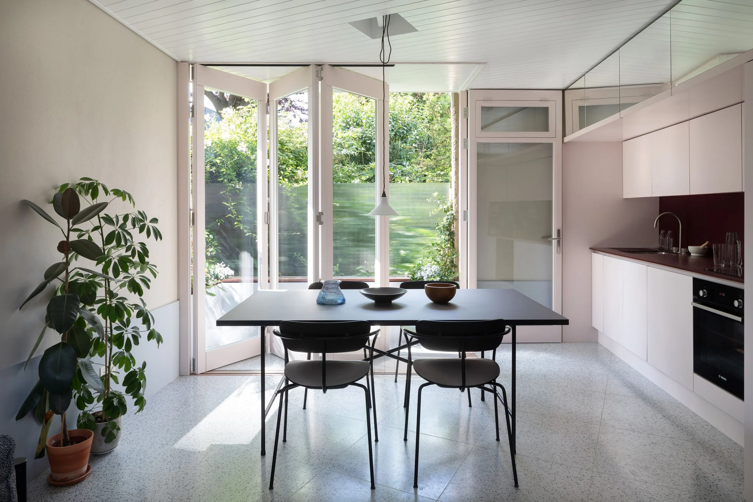 On the ground floor, the design creates a minimal yet textured feel, with built-in shelving, seating, and kitchen elements that connect seamlessly with the outdoor terrace. Large windows fold away entirely, transforming the dining area into a semi-outdoor space ideal for afternoon and evening use. Upstairs, two bedrooms and a bathroom are filled with natural light from skylights, while cork flooring and lime-rendered walls provide warmth, sound absorption, and a textured aesthetic.